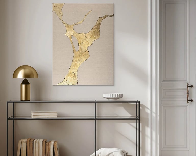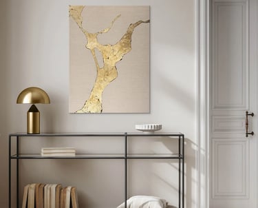 The paintings in the gold leaf collection are created using a gilding process that involves applying very thin sheets of gold (or similar metal alloys) to a surface or shape, giving it a shiny and elegant appearance. This ancient technique is used to decorate objects, furniture, walls, canvases, and even leather, and is applied to surfaces previously prepared with a "mission," a type of special glue.