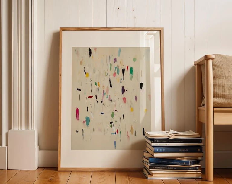 The abstract paintings in the collection are non-figurative artworks that distance themselves from the representation of objective reality, focusing instead on shapes, colors, and lines to express emotions or concepts independent of the external world. Rather than depicting recognizable objects, abstract art uses visual elements in unconventional ways that evoke an emotional or intellectual experience in the viewer.
