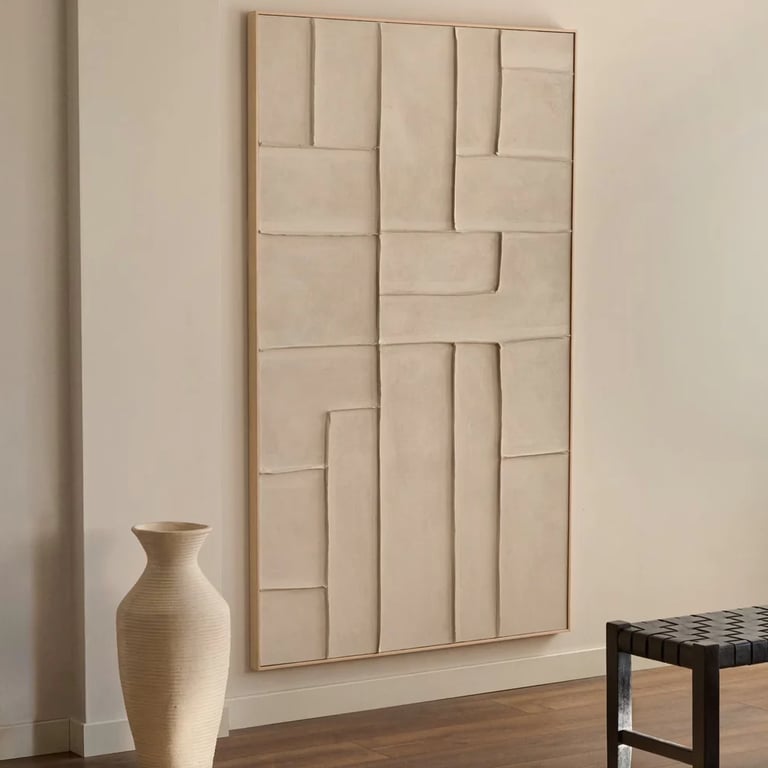 The collection of textured paintings are handmade works of art that transcend traditional two-dimensionality, adding a three-dimensional dimension through the use of materials other than simple paint, such as sand, stones, fabrics, wood, mortar, and more. The goal is to create a relief and texture on the surface of the work, breaking down the flatness and creating a more substantial and tactile aesthetic, becoming true objects of artistic design.