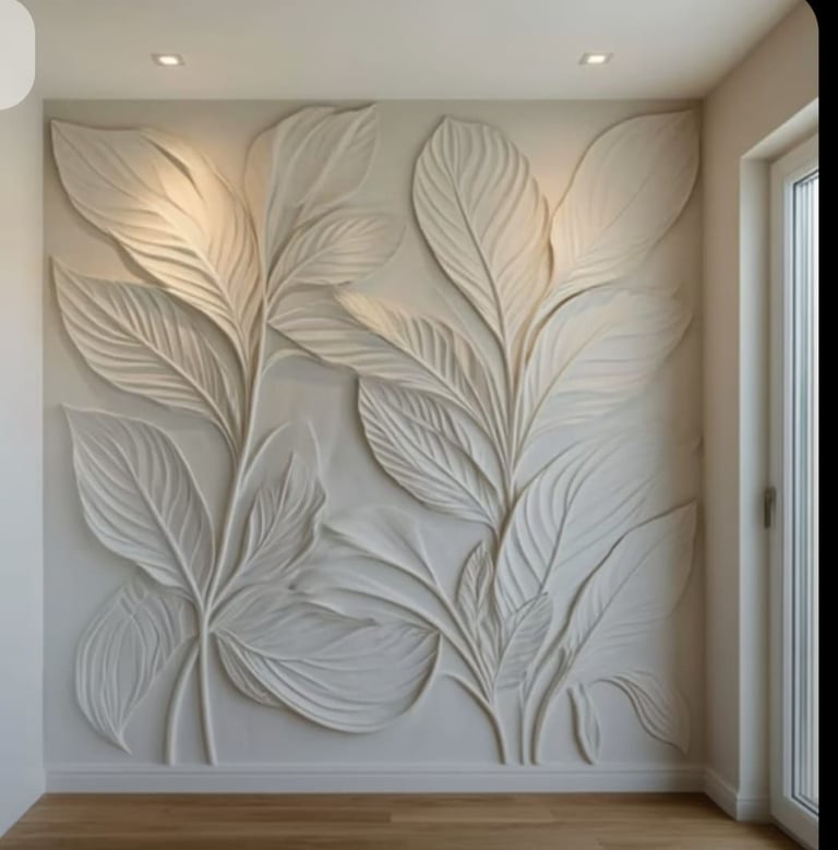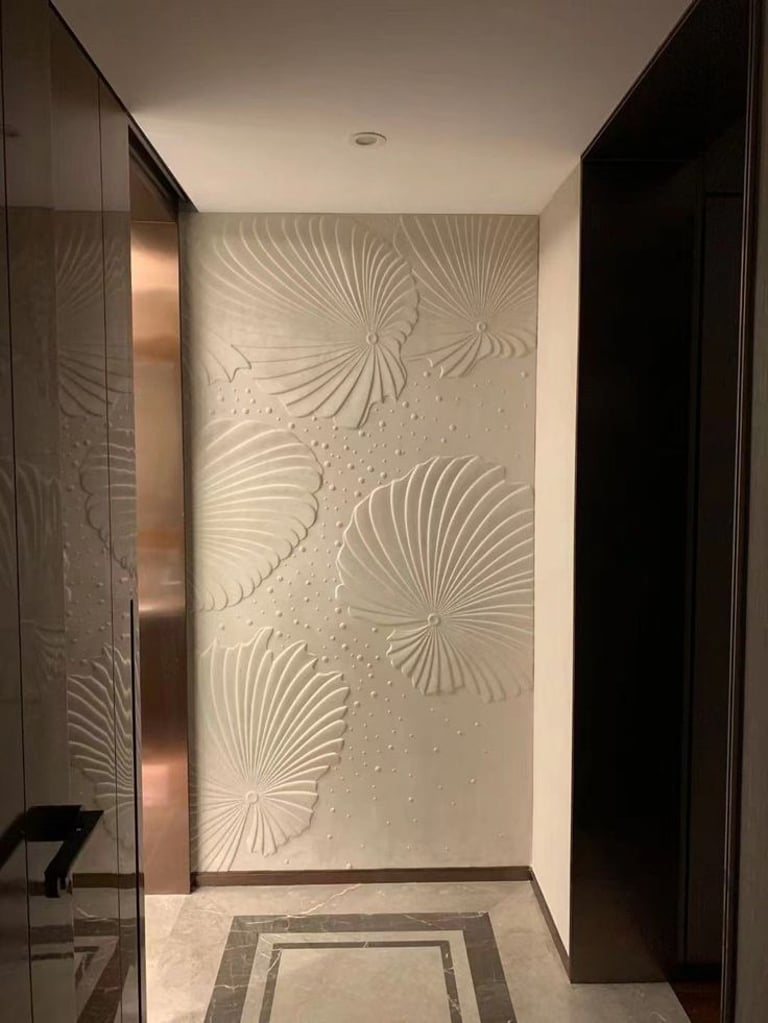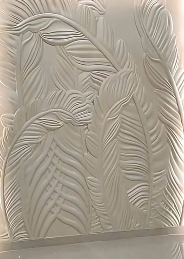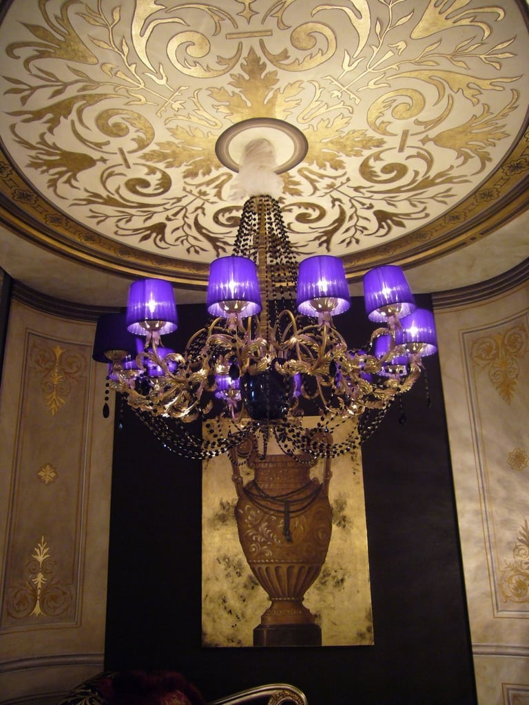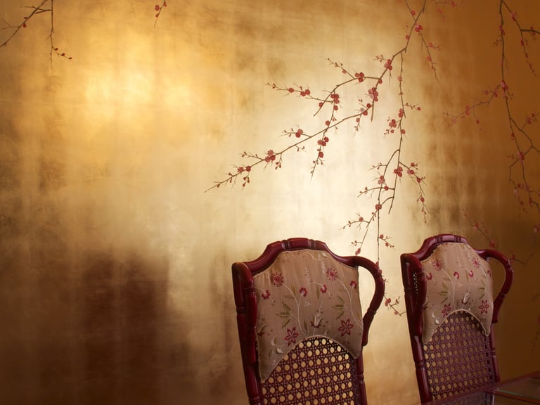Gold, silver, and bronze leaf wall and ceiling decorations, 3D carved relief decorations, graffiti and artistic design murals.